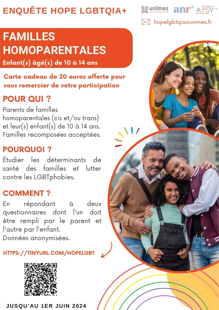 • La deuxième enquête s’adresse également aux familles homoparentales (cis/trans et les familles recomposées sont acceptées) mais ayant un/des enfant(s) âgé(s) entre 7 et 10 ans. Il s’agit d’un temps de jeu parent(s) – enfant(s) à domicile guidé par notre intervenant puis de la réalisation d’un questionnaire destiné au(x) parent(s) et d’un autre destiné à/aux enfant(s). Une compensation financière prenant la forme d’une carte cadeau de 40 euros sera donnée aux participant.e.s. Les participations sont acceptées jusqu’au 1 juin 2024. Les données sont anonymisées, leur traitement est conforme au RGPD. Il est tout à fait possible d’échanger avec nous avant de prendre une décision de participation. Nous nous rendons préférentiellement sur Paris, Orléans, Tours, Bourges, Lyon, Nîmes et Montpellier pour vous rencontrer mais n’hésitez pas à nous solliciter même si vous n’habitez pas ces zones pour que nous puissions prévoir un éventuel déplacement. Les personnes intéressées pour participer peuvent nous contacter par mail à : hopelgbtqia@unimes.fr